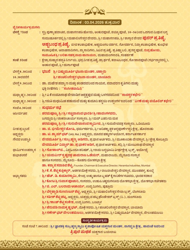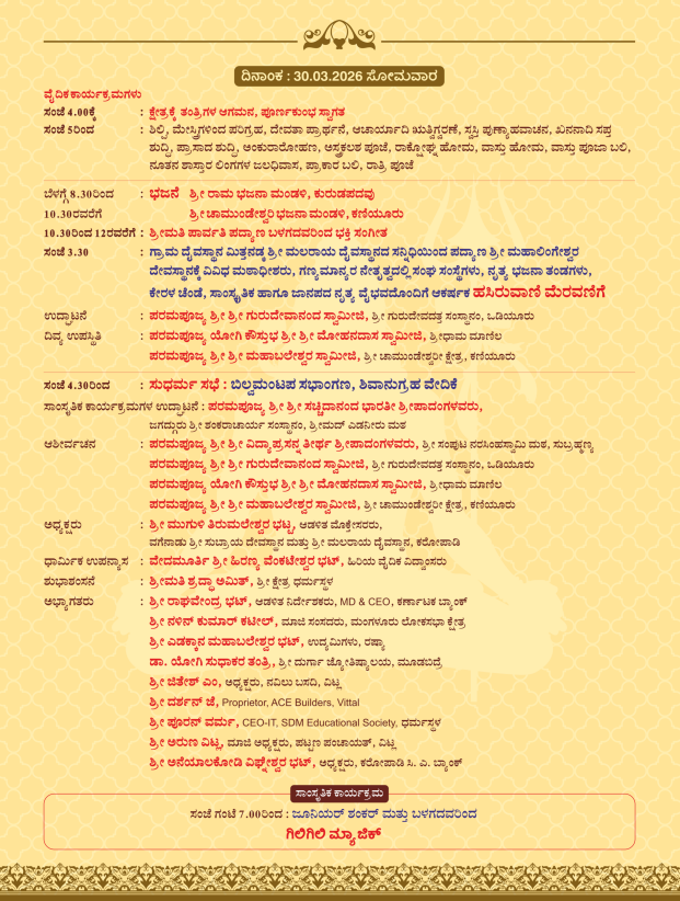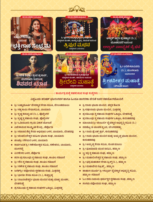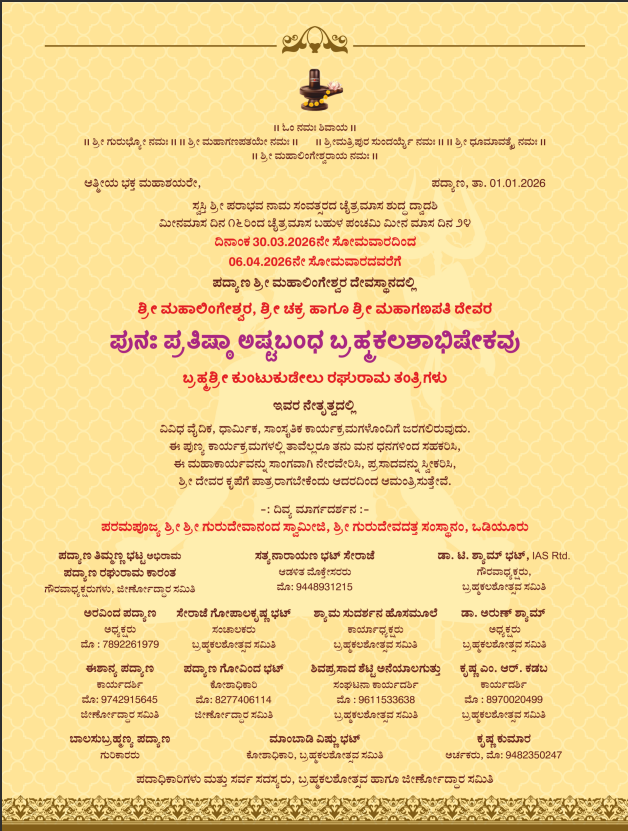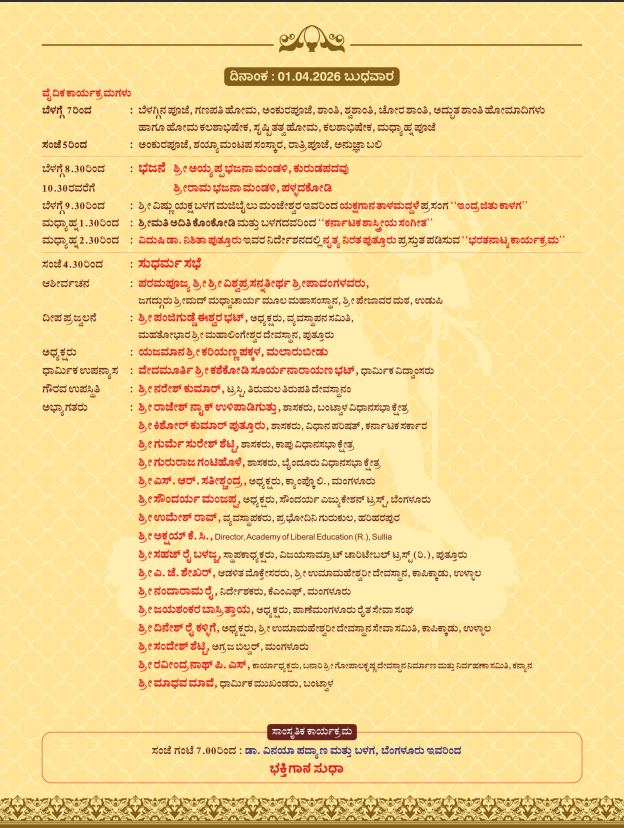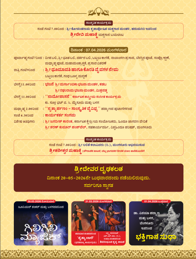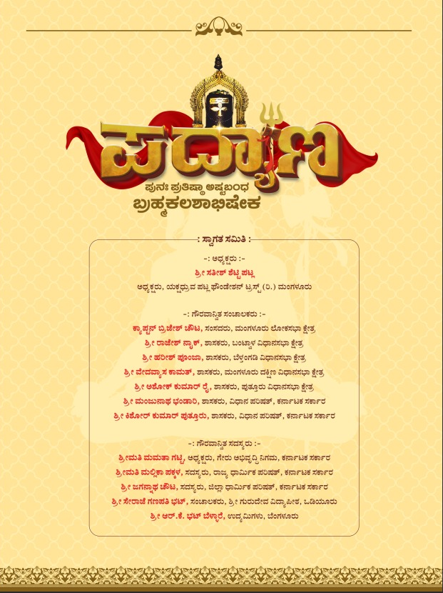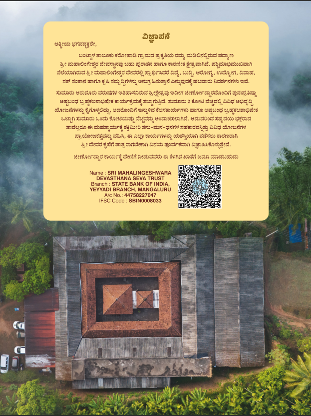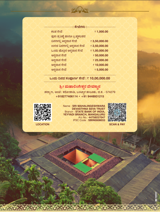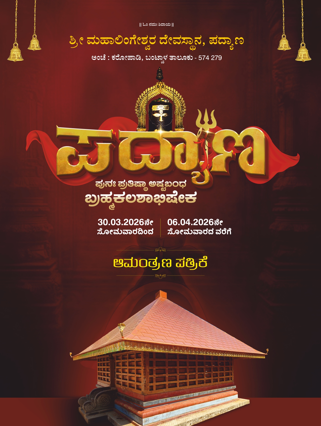 Padyana, a small hamlet situated in Karopadi village of Bantwal Taluk in Dakshina Kannada district, rests gracefully in the serene lap of nature. At the heart of this picturesque village stands the ancient and revered Sri Mahalingeshwara Temple Padyana, a sacred shrine that has been a spiritual center for devotees for centuries. The presiding deity, Lord Sri Mahalingeshwara, who faces west and resides along with his divine entourage, is believed to bless devotees with knowledge, wisdom, good health, employment, marriage, virtuous progeny, and agricultural prosperity. Numerous devotees testify to the grace and blessings received through sincere prayers offered at this holy shrine. Lord Mahalingeshwara of Padyana is also revered as a patron of art and culture. The temple has long been associated with the flourishing of traditional art forms such as Yakshagana, classical music, literature, and dance. The Sri Chakra Pooja conducted at the temple is especially unique.